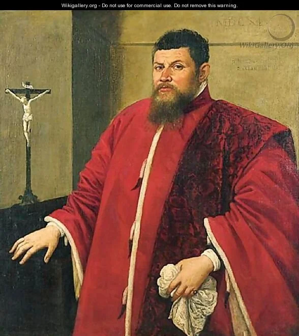 The robes of Venetian Senators were red brocades or velvets, with a stole over one shoulder, its color dependent on the symbolic character of the event. These images cover several centuries and manage to look much the same.